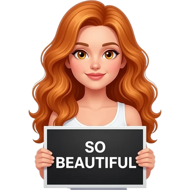 sexy girl with long wavy ginger hair and ginger eyes wearing a white tanktop is holding a black colored sign with SO BEAUTIFUL written on it emoji