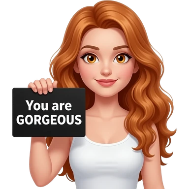 sexy girl with long wavy ginger hair and ginger eyes wearing a white tanktop is holding a black colored sign with You are GORGEOUS written on it emoji