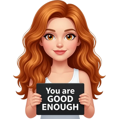 sexy girl with long wavy ginger hair and ginger eyes wearing a white tanktop is holding a black colored sign with You are GOOD ENOUGH written on it emoji