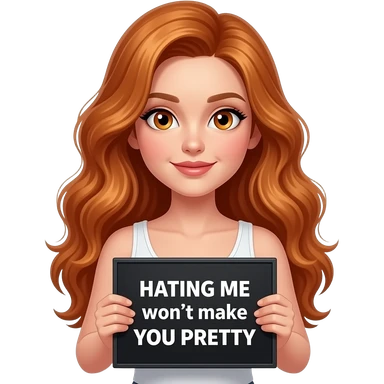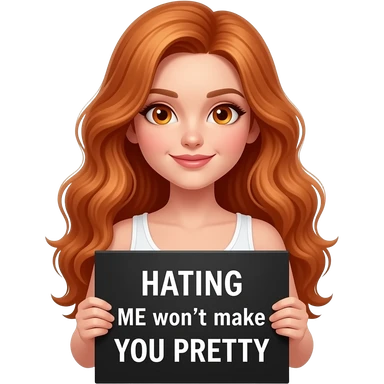 sexy girl with long wavy ginger hair and ginger eyes wearing a white tanktop is holding a black colored sign with HATING ME won't make YOU PRETTY written on it emoji