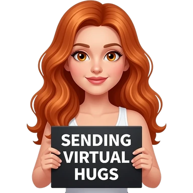 sexy girl with long wavy ginger hair and ginger eyes wearing a white tanktop is holding a black colored sign with SENDING VIRTUAL HUGS written on it emoji