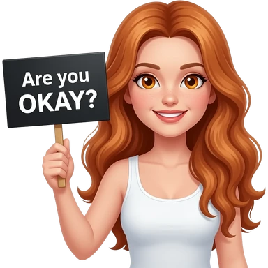 sexy girl with long wavy ginger hair and ginger eyes wearing a white tanktop is holding a black colored sign with Are you OKAY? written on it emoji
