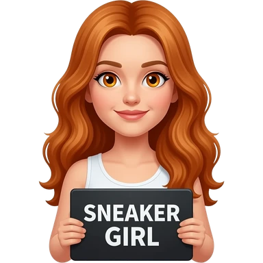 sexy girl with long wavy ginger hair and ginger eyes wearing a white tanktop is holding a black colored sign with SNEAKER GIRL written on it emoji