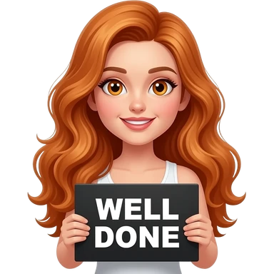 sexy girl with long wavy ginger hair and ginger eyes wearing a white tanktop is holding a black colored sign with WELL DONE written on it emoji