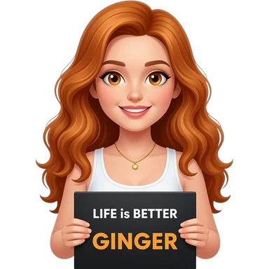 sexy girl with long wavy ginger hair and ginger eyes wearing a white tanktop is holding a black colored sign with LIFE is BETTER with a GINGER written on it emoji