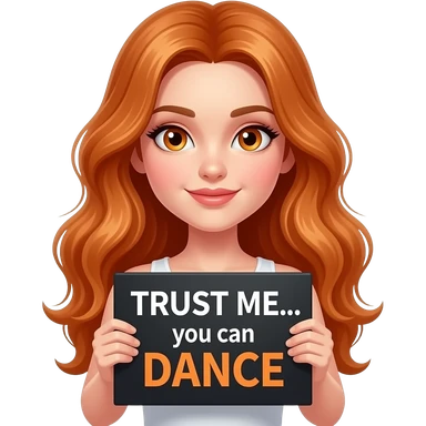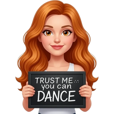 sexy girl with long wavy ginger hair and ginger eyes wearing a white tanktop is holding a black colored sign with TRUST ME... you can DANCE written on it emoji
