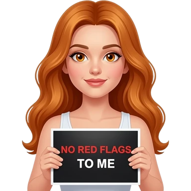 sexy girl with long wavy ginger hair and ginger eyes wearing a white tanktop is holding a black colored sign with NO RED FLAGS TO ME written on it emoji