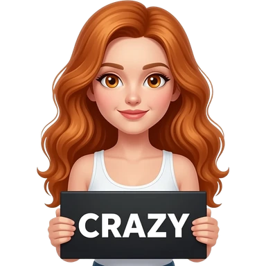 sexy girl with long wavy ginger hair and ginger eyes wearing a white tanktop is holding a black colored sign with CRAZY written on it emoji
