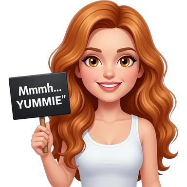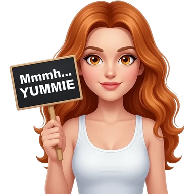 sexy girl with long wavy ginger hair and ginger eyes wearing a white tanktop is holding a black colored sign with Mmmh... YUMMIE written on it emoji