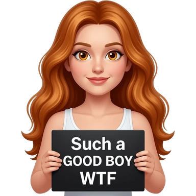 sexy girl with long wavy ginger hair and ginger eyes wearing a white tanktop is holding a black colored sign with Such a GOOD BOY WTF written on it emoji