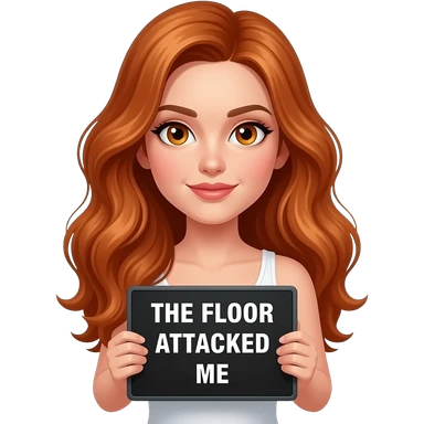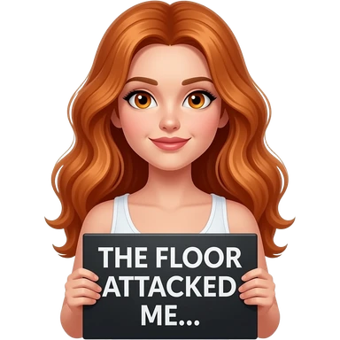 sexy girl with long wavy ginger hair and ginger eyes wearing a white tanktop is holding a black colored sign with THE FLOOR ATTACKED ME... written on it emoji