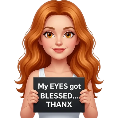 sexy girl with long wavy ginger hair and ginger eyes wearing a white tanktop is holding a black colored sign with My EYES got BLESSED... THANX written on it emoji