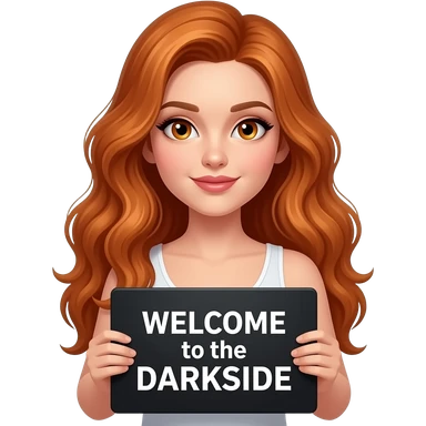 sexy girl with long wavy ginger hair and ginger eyes wearing a white tanktop is holding a black colored sign with WELCOME to the DARKSIDE written on it emoji