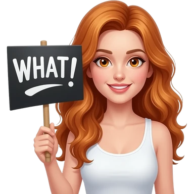sexy girl with long wavy ginger hair and ginger eyes wearing a white tanktop is holding a black colored sign with WHAT! written on it emoji
