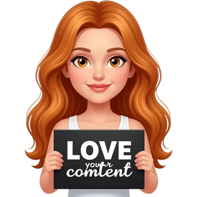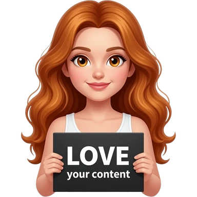 sexy girl with long wavy ginger hair and ginger eyes wearing a white tanktop is holding a black colored sign with LOVE your content written on it emoji