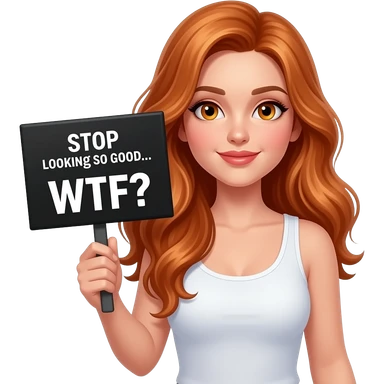 sexy girl with long wavy ginger hair and ginger eyes wearing a white tanktop is holding a black colored sign with STOP looking so GOOD... WTF written on it emoji