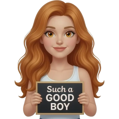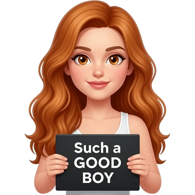 sexy girl with long wavy ginger hair and ginger eyes wearing a white tanktop is holding a black colored sign with Such a GOOD BOY written on it emoji