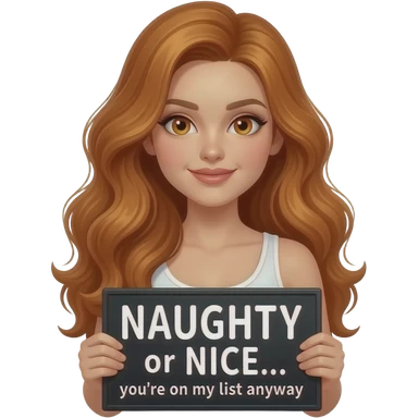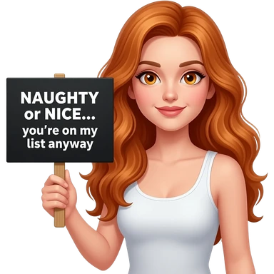 sexy girl with long wavy ginger hair and ginger eyes wearing a white tanktop is holding a black colored sign with NAUGHTY or NICE... you're on my list anyway written on it emoji
