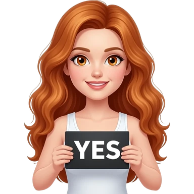 sexy girl with long wavy ginger hair and ginger eyes wearing a white tanktop is holding a black colored sign with YES written on it emoji