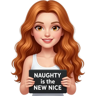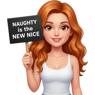 sexy girl with long wavy ginger hair and ginger eyes wearing a white tanktop is holding a black colored sign with NAUGHTY is the NEW NICE written on it emoji