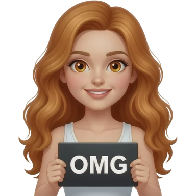 sexy girl with long wavy ginger hair and ginger eyes wearing a white tanktop is holding a black colored sign with OMG written on it emoji