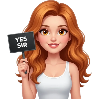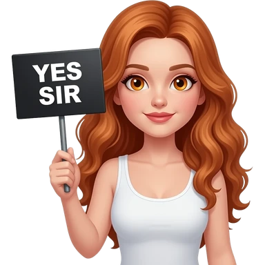 sexy girl with long wavy ginger hair and ginger eyes wearing a white tanktop is holding a black colored sign with YES SIR written on it emoji