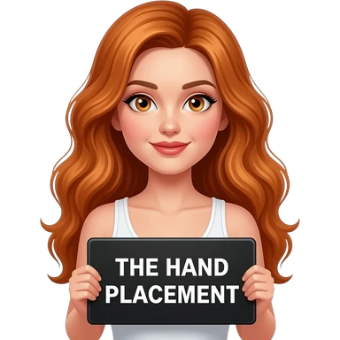 sexy girl with long wavy ginger hair and ginger eyes wearing a white tanktop is holding a black colored sign with THE HAND PLACEMENT written on it emoji
