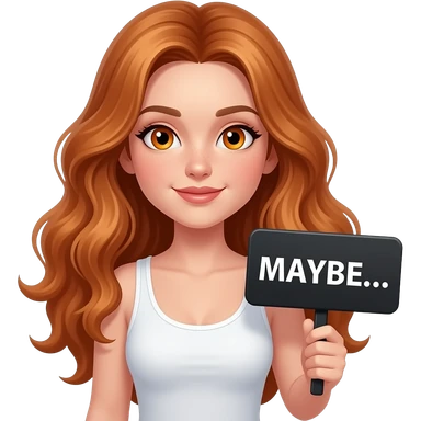 sexy girl with long wavy ginger hair and ginger eyes wearing a white tanktop is holding a black colored sign with MAYBE... written on it emoji