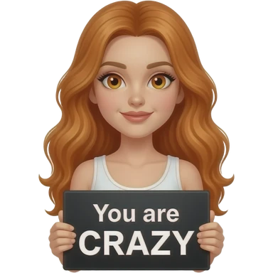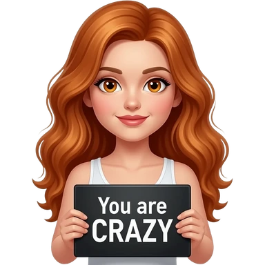 sexy girl with long wavy ginger hair and ginger eyes wearing a white tanktop is holding a black colored sign with You are CRAZY written on it emoji