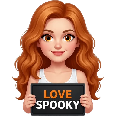sexy girl with long wavy ginger hair and ginger eyes wearing a white tanktop is holding a black colored sign with LOVE SPOOKY written on it emoji