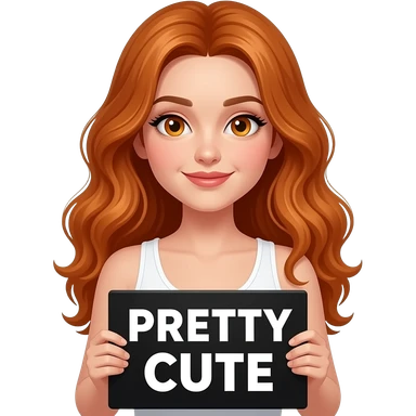 sexy girl with long wavy ginger hair and ginger eyes wearing a white tanktop is holding a black colored sign with PRETTY CUTE written on it emoji
