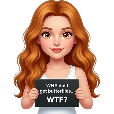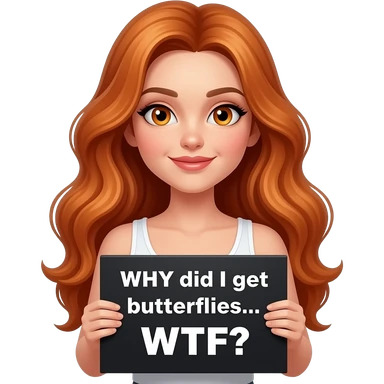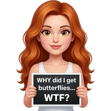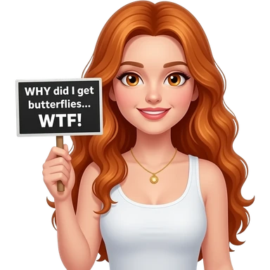 sexy girl with long wavy ginger hair and ginger eyes wearing a white tanktop is holding a black colored sign with WHY did I get butterflies... WTF! written on it emoji