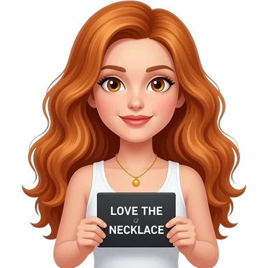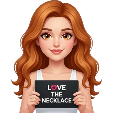 sexy girl with long wavy ginger hair and ginger eyes wearing a white tanktop is holding a black colored sign with LOVE THE NECKLACE written on it emoji