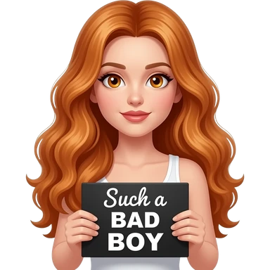 sexy girl with long wavy ginger hair and ginger eyes wearing a white tanktop is holding a black colored sign with Such a BAD BOY written on it emoji