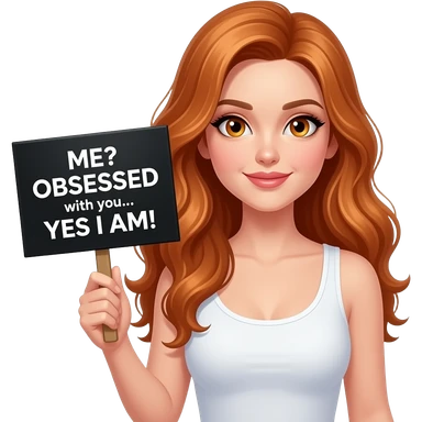 sexy girl with long wavy ginger hair and ginger eyes wearing a white tanktop is holding a black colored sign with ME? OBSESSED with you... YES I AM! written on it emoji
