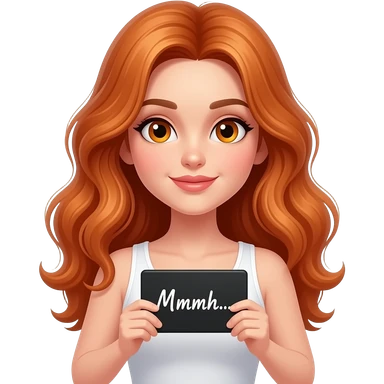 sexy girl with long wavy ginger hair and ginger eyes wearing a white tanktop is holding a black colored sign with Mmmh... written on it emoji