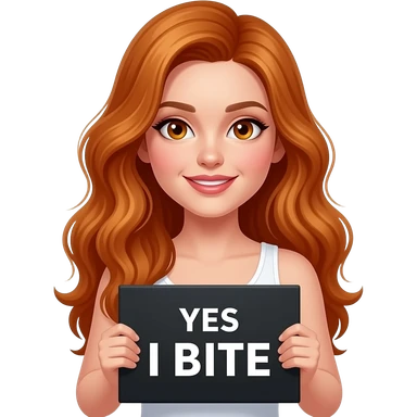 sexy girl with long wavy ginger hair and ginger eyes wearing a white tanktop is holding a black colored sign with YES I BITE written on it emoji