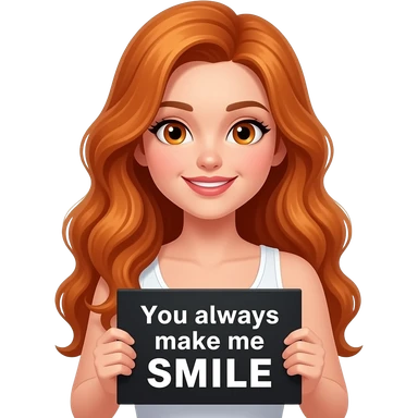 sexy girl with long wavy ginger hair and ginger eyes wearing a white tanktop is holding a black colored sign with You always make me SMILE written on it emoji