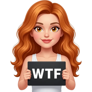 sexy girl with long wavy ginger hair and ginger eyes wearing a white tanktop is holding a black colored sign with WTF written on it emoji