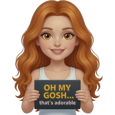 sexy girl with long wavy ginger hair and ginger eyes wearing a white tanktop is holding a black colored sign with OH MY GOSH... that's adorable written on it emoji