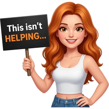 sexy girl with long wavy ginger hair and ginger eyes wearing a white tanktop is holding a black colored sign with This isn't HELPING... written on it emoji