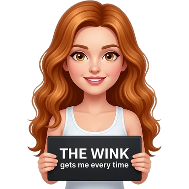 sexy girl with long wavy ginger hair and ginger eyes wearing a white tanktop is holding a black colored sign with THE WINK gets me everytime written on it emoji