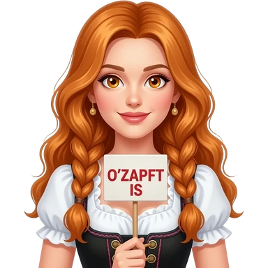 sexy girl with long wavy ginger braids and ginger eyes wearing a dirndl is holding a sign with O'ZAPFT IS written on it emoji