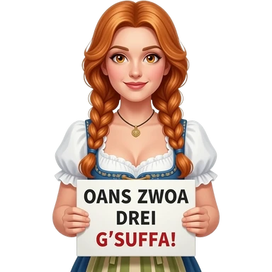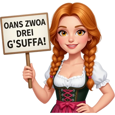 sexy girl with long wavy ginger braids and ginger eyes wearing a dirndl is holding a sign with OANS ZWOA DREI G'SUFFA! written on it emoji