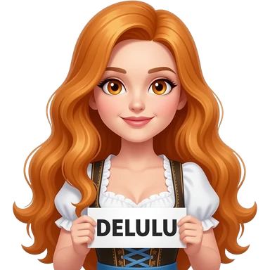 sexy girl with overlong ginger hair and ginger eyes wearing a dirndl holding DELULU sign emoji