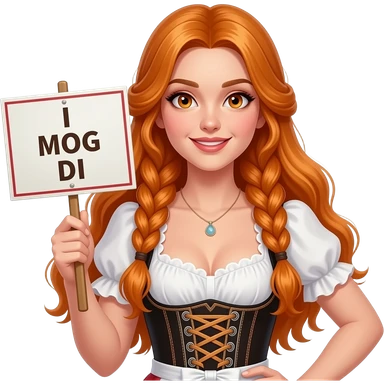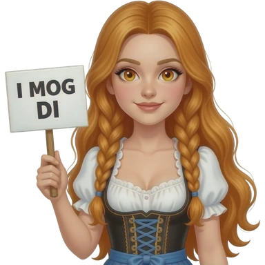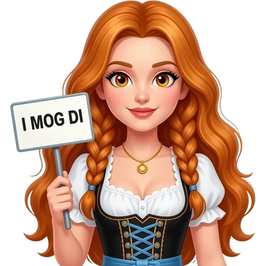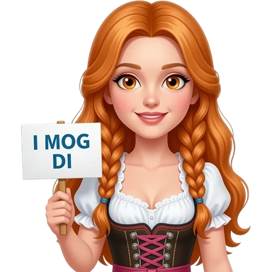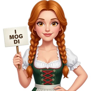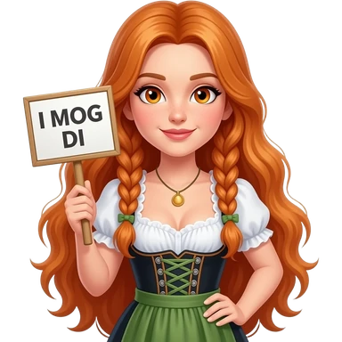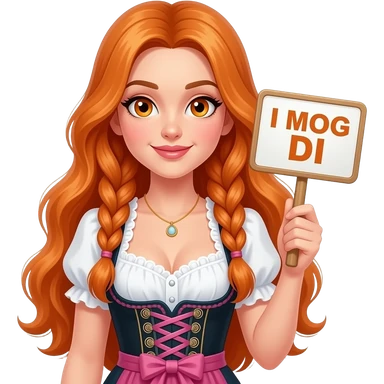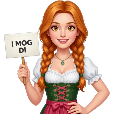 sexy girl with overlong ginger hair in braids and ginger eyes wearing a dirndl holding a I MOG DI sign emoji