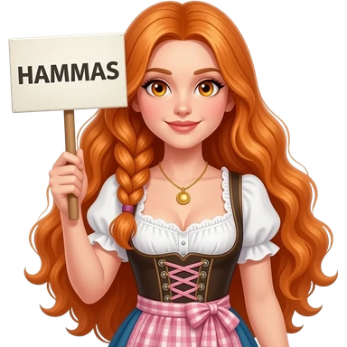 sexy girl with overlong ginger hair in braids and ginger eyes wearing a dirndl holding a HAMMAS sign emoji