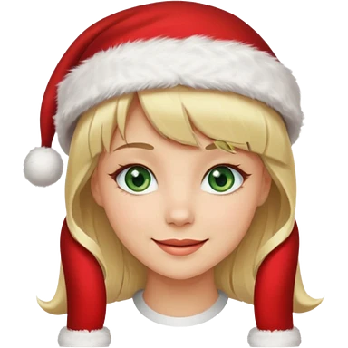 Beautiful smiling green eyed blonde with bangs wearing a Santa hat emoji