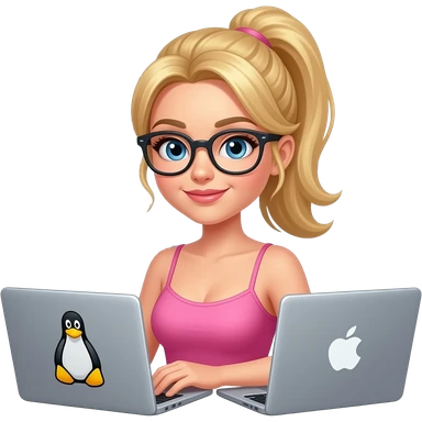 Sexy girl, blonde, blue eyes, slavic, ponytail, pink spaghetti strap, glasses, coder, 2x laptop (1 with linux logo, 1 with apple logo), computer code background emoji
