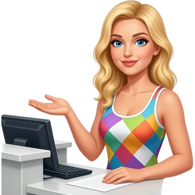 Sexy girl, blonde, blue eyes, slavic, sexy hair style, angle view, colorful tanktop, receptionist at front desk emoji